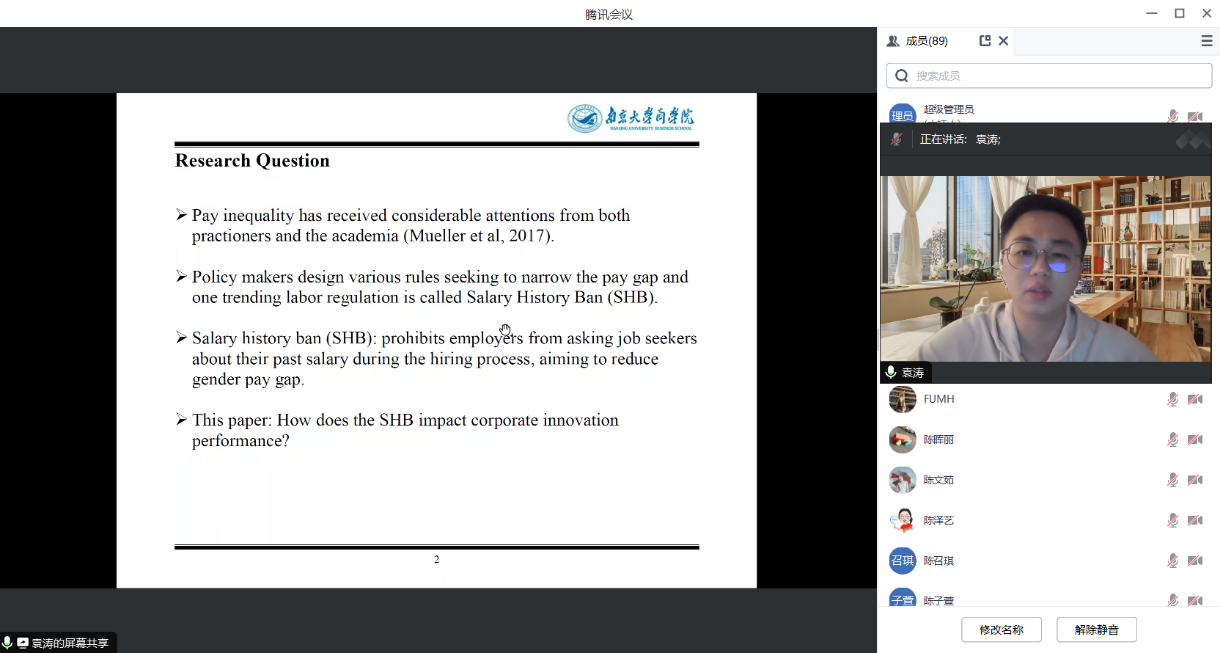 在论文报告环节,袁涛老师首先介绍了美国的薪酬历史禁令(Salary History Ban)及其相关研究,在此基础上探讨薪酬历史禁令的出台对企业创新的影响。研究发现,薪酬历史禁令的出台降低了企业创新水平。进一步的机制分析表明,薪酬历史禁令在减少性别工资差距的同时降低了男性员工工作的积极性,对企业创新活动产生负面影响。此外,薪酬历史禁令的出台可能会加剧就业市场的信息不对称,导致企业在招聘过程中出现 “逆向选择”,降低研发人员的招聘质量。在交流环节,公司师生就论文的异质性检验、结论在国内的适用性以及中介效应方法的使用等学术问题与袁涛老师进行了深入的探讨。