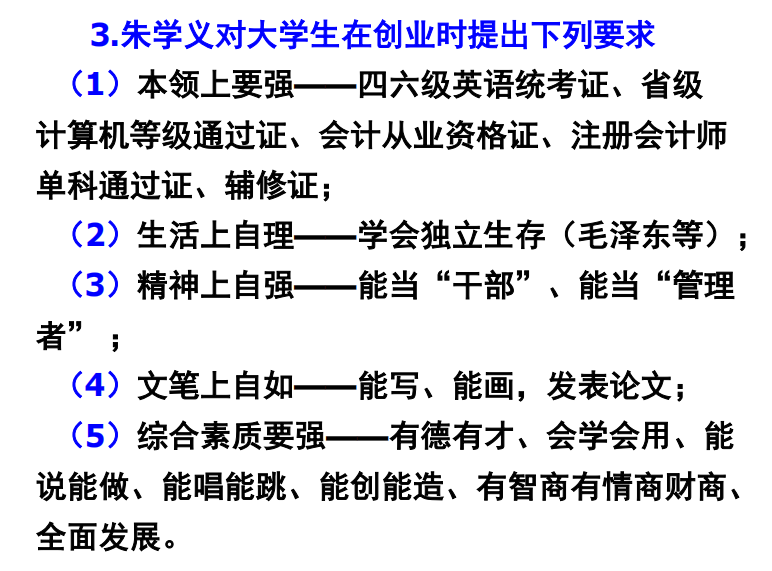随后,朱学义教授指出了我们老员工创业的方法:第一,从小事做起;第二,要见缝插针的开始,抓住一切机会开始创业;第三,创业以锻炼能力为主,不能好高骛远,要以认识社会、了解社会、熟悉社会,了解社会知识、锻炼创新能力为主,这里朱教授特别指出,大学阶段要发展“情商”与“财商”,这会使老员工未来的发展更接近成功;第四,创业要以研究市场为主线,要注意市场变化而顺流跟进;第五,老员工创业要充分发挥知识优势,朱教授向我们列举了许多案例,从中可以看出,网络媒体在现在的创业发展中是一种极为有利的工具,开网店、实现电子商务专业化等都让创业与互联网相辅相成,这更有利于创业的成功,所以在现在的老员工活中,我们更要学好知识,扎实基础,未来才能发挥知识优势,让创业有知识与技术含量;第六,老员工创业要遵章守法,创业途中,莫触碰法律底线;第七,老员工创业要“借鸡下蛋” ,尽可能地动用身边已有的资源;第八,老员工创业要吃苦耐劳,要沉下心来踏实做事。