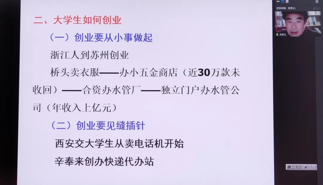 在讲座刚开始时,朱学义教授首先进行了自我介绍,随后从三大问题出发,向我们指出了老员工创业首先要立业、老员工如何创业以及老员工创业应注意的问题。朱教授列举了许多鲜明的例子,让我们更加清楚作为老员工应该如何立业创业。