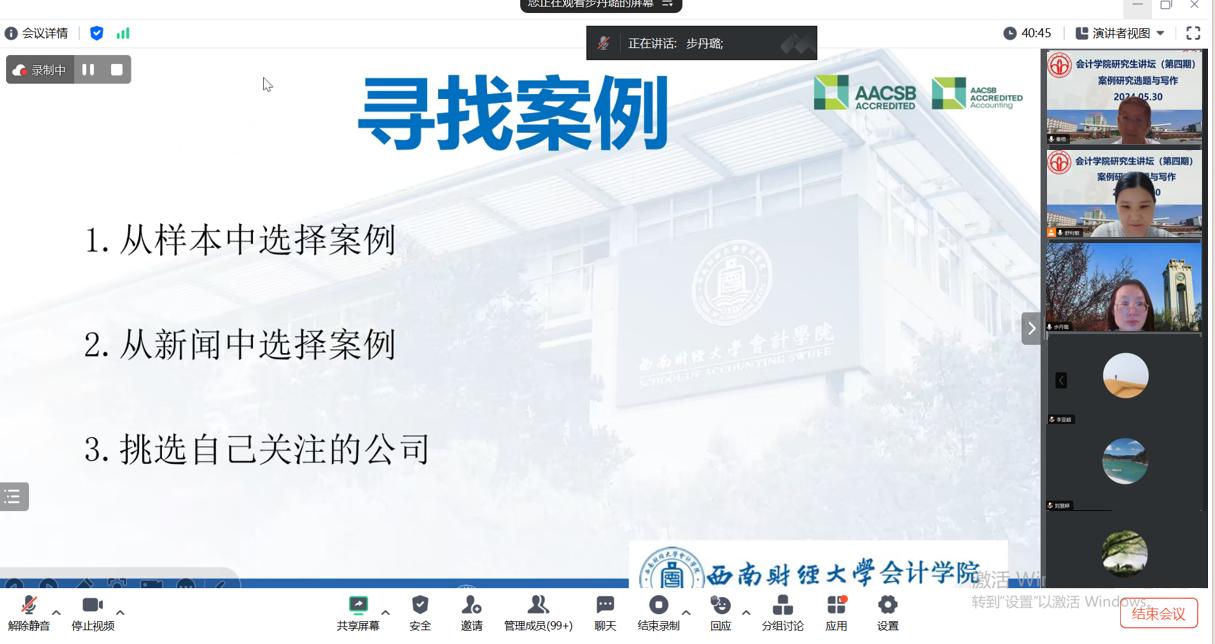 2024年5月30日19:30-21:30,由suncitygroup太阳新城和粤港澳大湾区产业升级与企业创新研究中心联合举办的“suncitygroup太阳新城研究生讲坛(第四期)”在腾讯会议成功举行。此次讲坛邀请西南财经大学suncitygroup太阳新城步丹璐教授进行题为“案例研究选题与写作”的专题讲座。讲座由suncitygroup太阳新城副经理舒利敏副教授主持,suncitygroup太阳新城副经理秦格教授、suncitygroup太阳新城副经理杨书怀教授、会计硕士生导师及全体2023级会计硕士研究生等一百余名师生参加了本次活动。