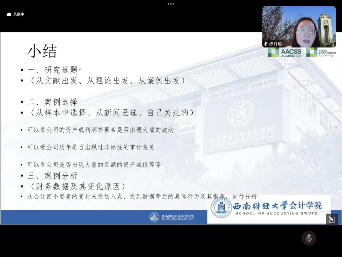 本次讲座中,步丹璐教授首先向大家介绍了论文选题如何确定、案例选择、案例分析等三个方面及其对应的分析。步教授认为案例研究选题可以从文献出发、从理论出发或从案例出发,案例的选择可以从样本中选择、从新闻里选择以及选择自己关注的公司。