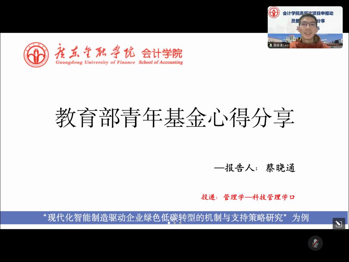 蔡晓通博士结合自己的课题,详细阐述了申报过程中的关键环节与经验。他以自己的项目申报经历为例,强调了合理选择申报学科类别的重要性。他还建议,申报书题目需具备新颖性和学科交叉性,选题依据应涵盖国家战略、现实问题、研究主题及预期效果等内容。同时,他还分享了自己在文献综述、研究内容、研究思路图、研究方法、预期成果等方面的写作心得。
