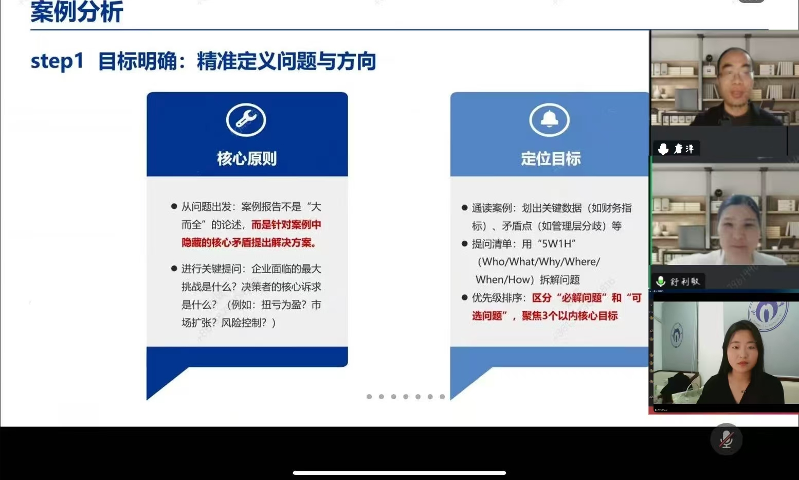 接着,唐教授从大赛的组织和动员方面分享了南华大学的经验,鼓励员工积极参赛。在案例分析与文本撰写方面,唐教授结合实际案例,详细介绍了如何进行案例分析并撰写高质量的案例分析报告。具体而言,首先抓住主要矛盾,从材料中提炼潜在问题,聚焦核心问题,从材料冲突点提炼结论,突出报告核心,实现“结论先行,逻辑穿透”。其次,从财务、战略、运营、风险等维度拆解核心结论,跨维度交叉论证。最后,选择直接影响结论的数据,通过横纵向、目标(行业平均)对比以增强数据说服力;并将数据进行可视化,提高复杂数据资料的可读性。