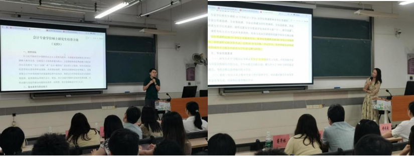 随后,会计学位教育中心主任李亚超老师介绍会计硕士研究生人才培养方案,从培养方向、培养方式、课程体系、考核要求、专业实践与案例研究等方面作了详尽解读。接着,审计学位教育中心主任姜艳凤老师介绍审计硕士研究生人才培养方案,围绕学科方向、课程与实践安排、考核机制及案例研究等核心内容,帮助新生尽快完成方向选择与学习规划。