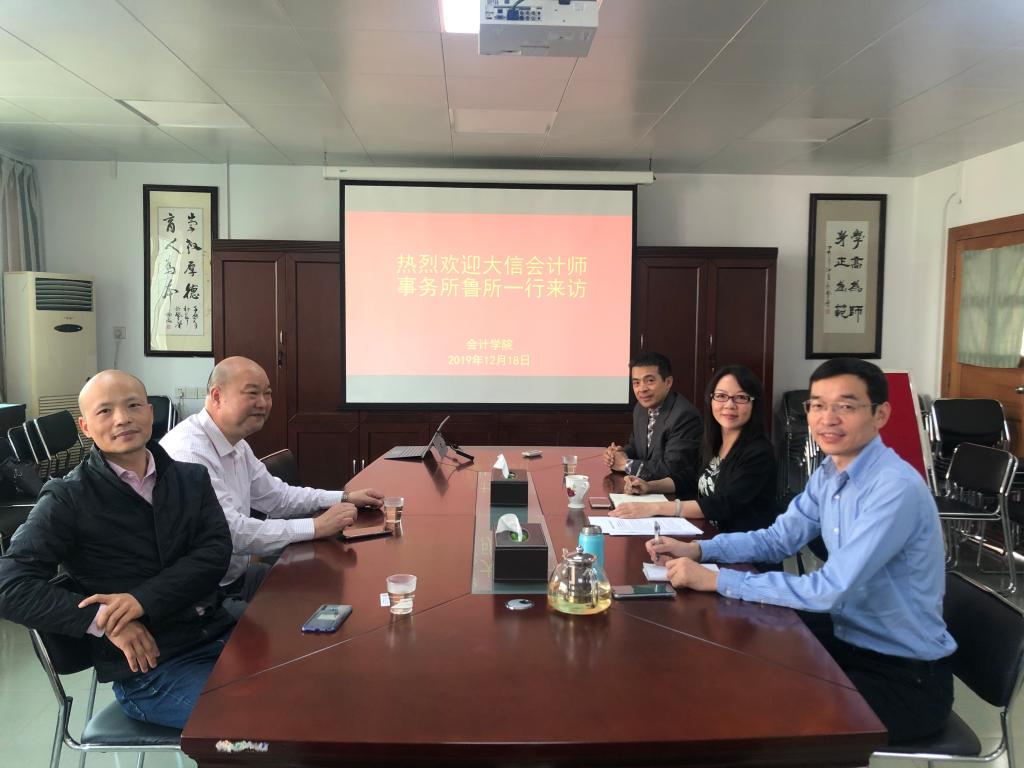 2019年12月18日上午,大信(广州)会计师事务所领导鲁友国和龚甫国一行来公司交流,suncitygroup太阳新城文芳经理、赖志成书记、马鹏副经理热情接待了鲁所一行。文芳经理和赖志成书记对鲁所一行莅临公司指导表示热烈的欢迎,对为公司发展提供的支持表示衷心的感谢。两位领导分别介绍了suncitygroup太阳新城的发展历程和人才培养情况及员工实习就业情况,并就今后的业务合作进行了洽谈。鲁所感谢公司领导的热情接待,表示将一起努力建设好实习基地,欢迎更多suncitygroup太阳新城的学子到大信实习就业。最后,文芳经理向鲁友国所长颁发了suncitygroup太阳新城校外导师聘书,并进行了合影留念。