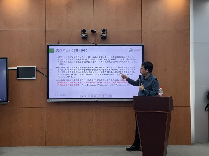 讲座伊始,曹春芳教授指出,经济中大多数资源配置实际上发生在公司内部而非市场内部,这是理解企业集团行为的核心。他比较了中美企业治理组织结构差异:美国以单一法人为主,而中国则以多法人企业集团为主,我国多法人企业集团营业收入合计占GDP比重超过80%。这一结构性差异决定了中国企业集团研究的特殊性与重要性。曹教授还回顾了美国企业集团的历史沿革,指出这些历史经验对中国企业集团发展具有一定的启示意义。